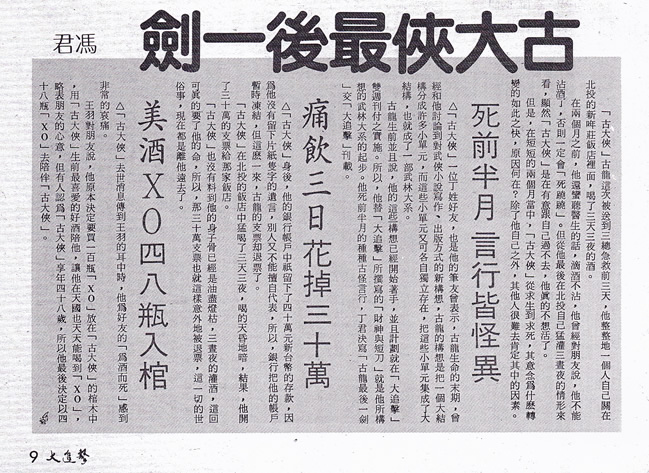 王羽对朋友说,他原本决定要买一百瓶“XO”放在“古大侠”的棺木中,用“古大侠”生前最喜爱的好酒陪他,让他在天国也天天能喝到“XO”,略表朋友的心意,但有人认为“古大侠”享年四十八岁,所以他最后决定以四十八瓶“XO”去陪伴“古大侠”。