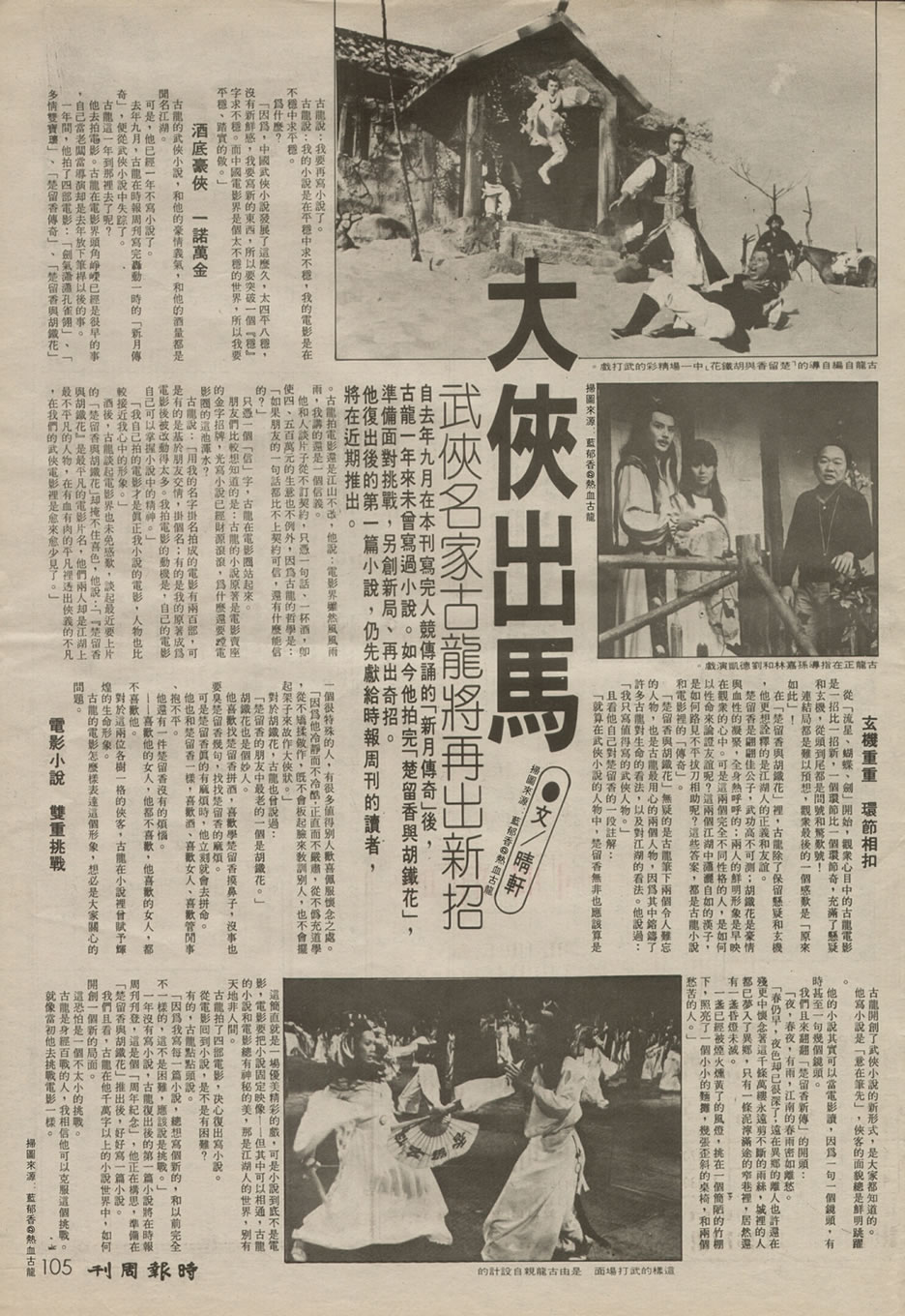 自去年九月在本刊亵玩人竞传诵的“新月传奇”后,古龙一年来未曾写过小说。如今他拍完“楚留香与胡铁花”,准备面对挑战,另创新局、再出奇招。他复出后的第一篇小说,仍先献给时报周刊的读者,将在近期推出。