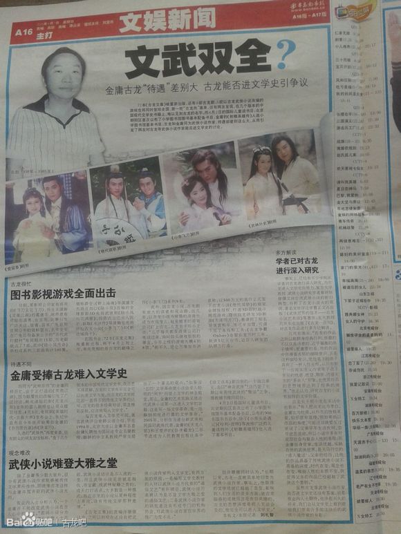 久违的“武侠热”再度来袭,但有眼尖的网友却发帖称:“查了几个版本的中国现代文学史书,我百思不得其解,古龙的文学水平完全可以比美文学大家,而古龙的文学地位却一直得不到传统文学界的认可。古龙的很多经典对话,简直精彩至极,应该被写入文学史。”